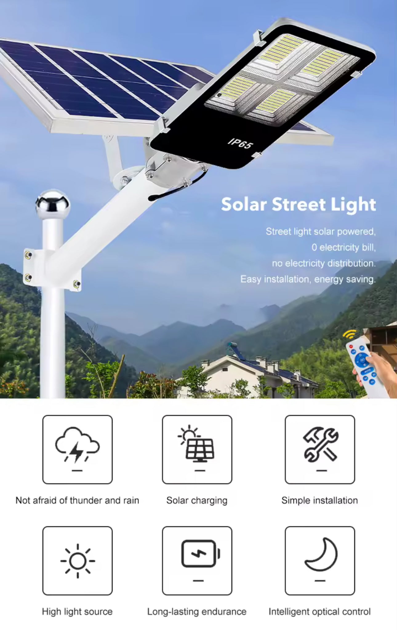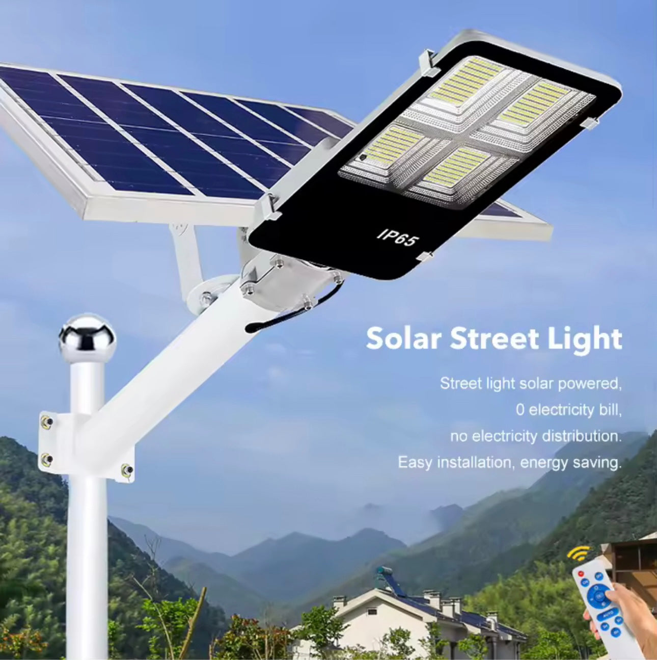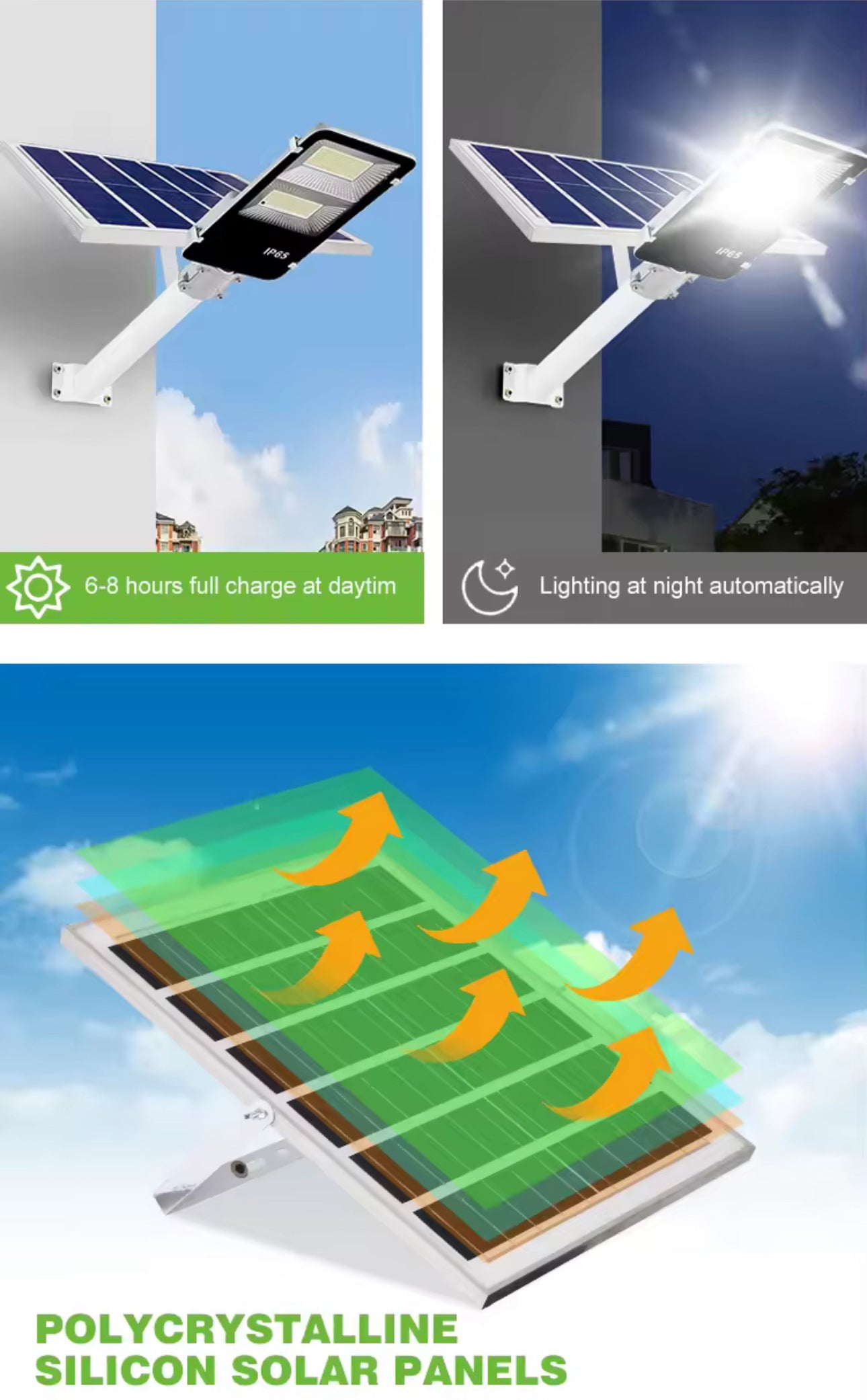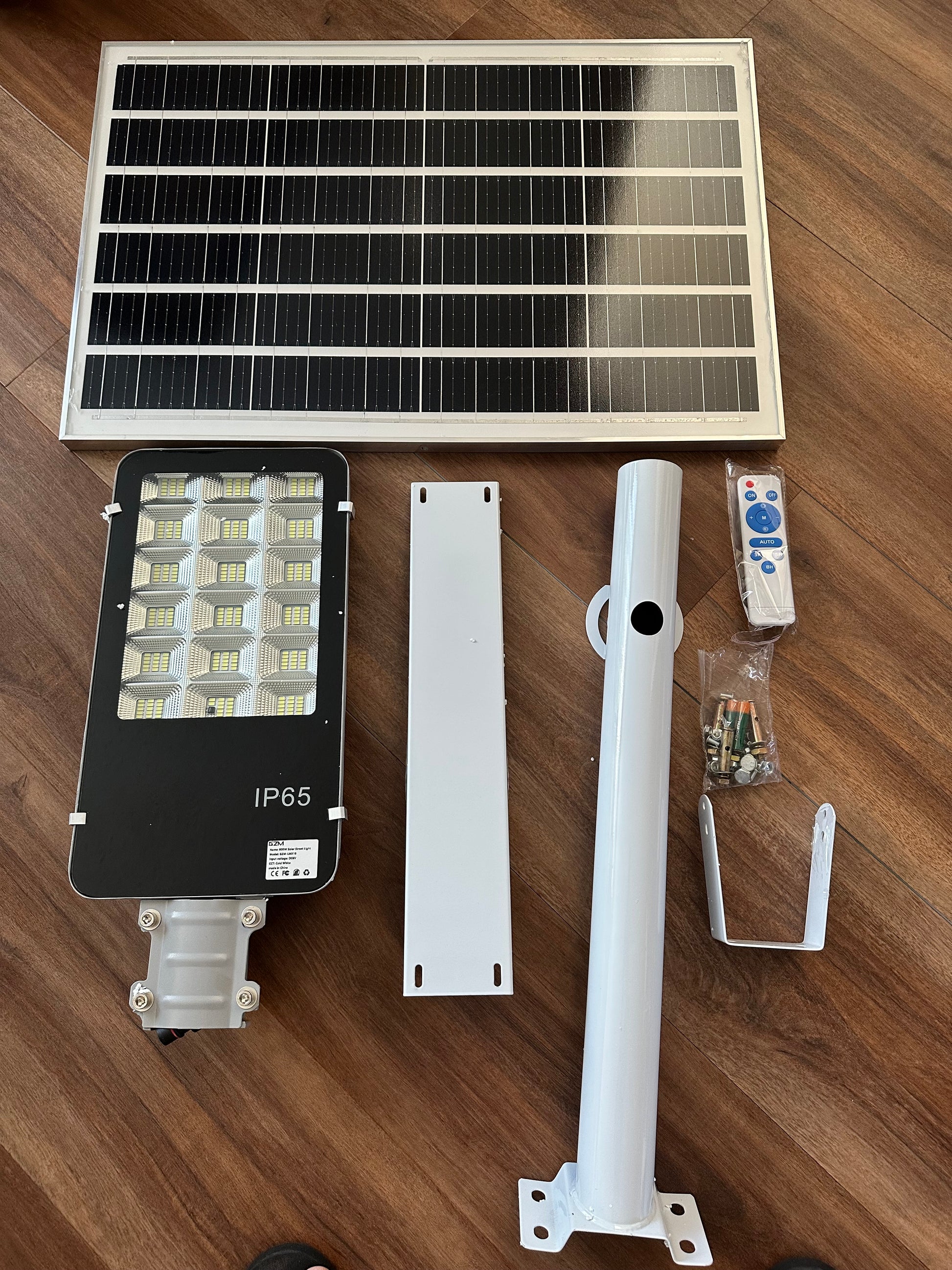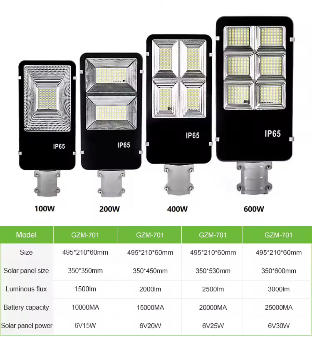GZM Solar Street Light, 800W, LED cool white light, IP67 waterproof, weatherproof, die cast aluminum, polycrystalline silicon solar panel, remote control.