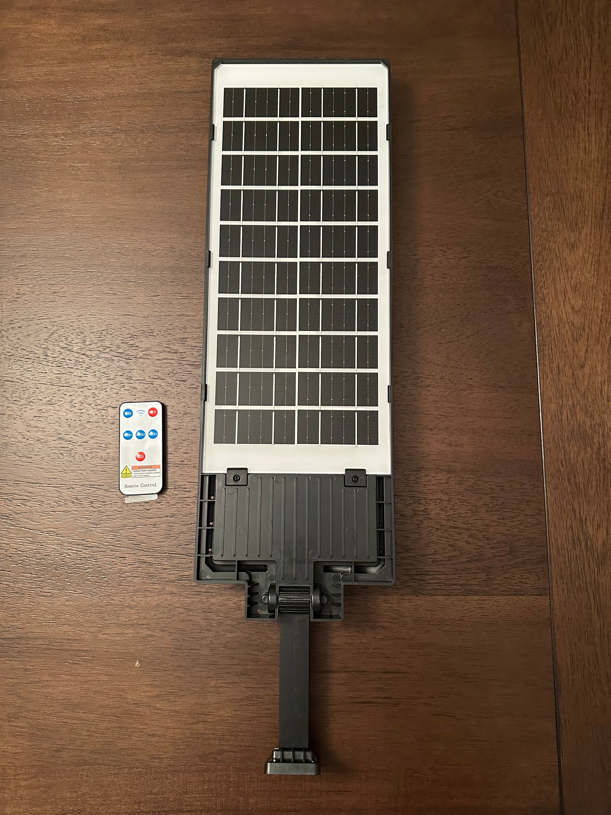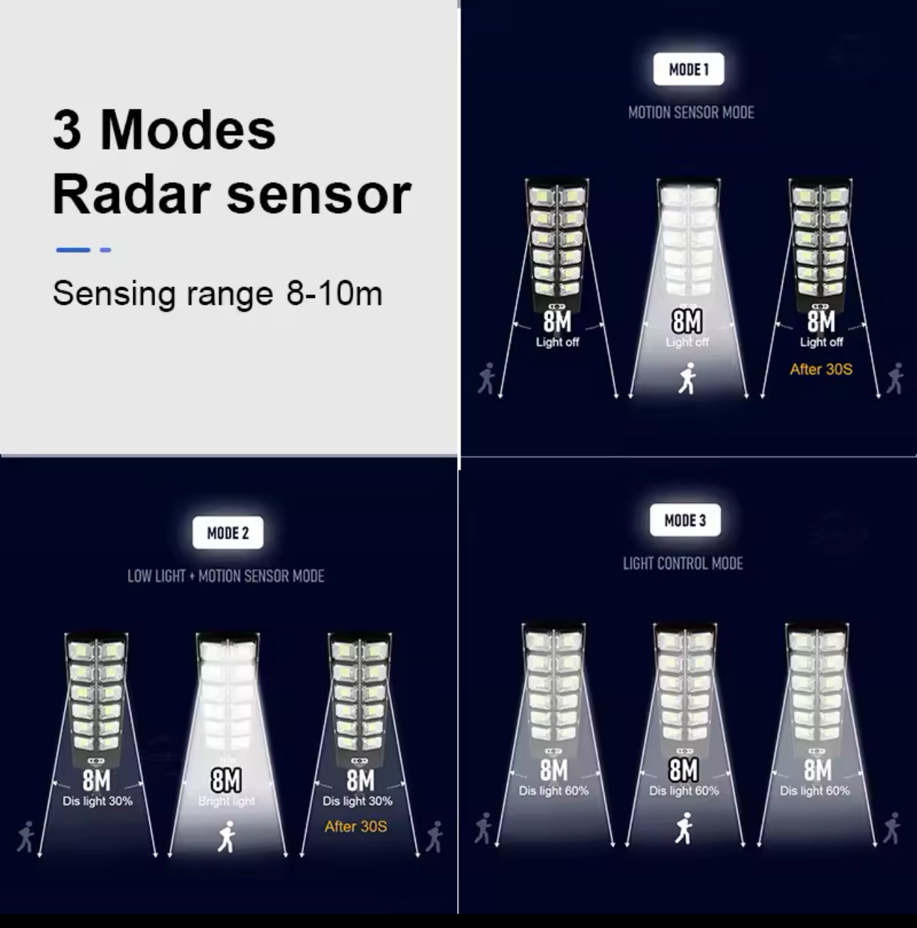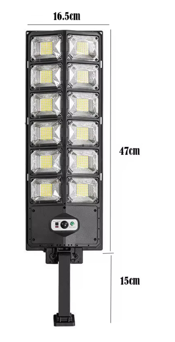 Solar Street Light, brand new, 1000W, with motion sensor, 3 lighting modes, charges battery during day, auto ON at dusk, 120 deg sensor range, large capacity 18650 battery, lithium iron phosphate battery, fast charging and long service life, 504 LEDs, polycrystalline silicon solar panel. Great for safety and security lighting for your backyard, driveway, pathways, patio, deck. Zero electricity bills. Great lighting for the cottage.
