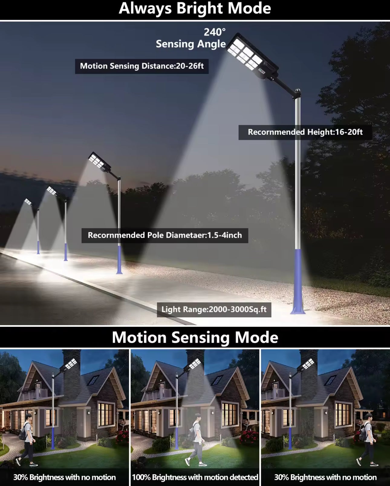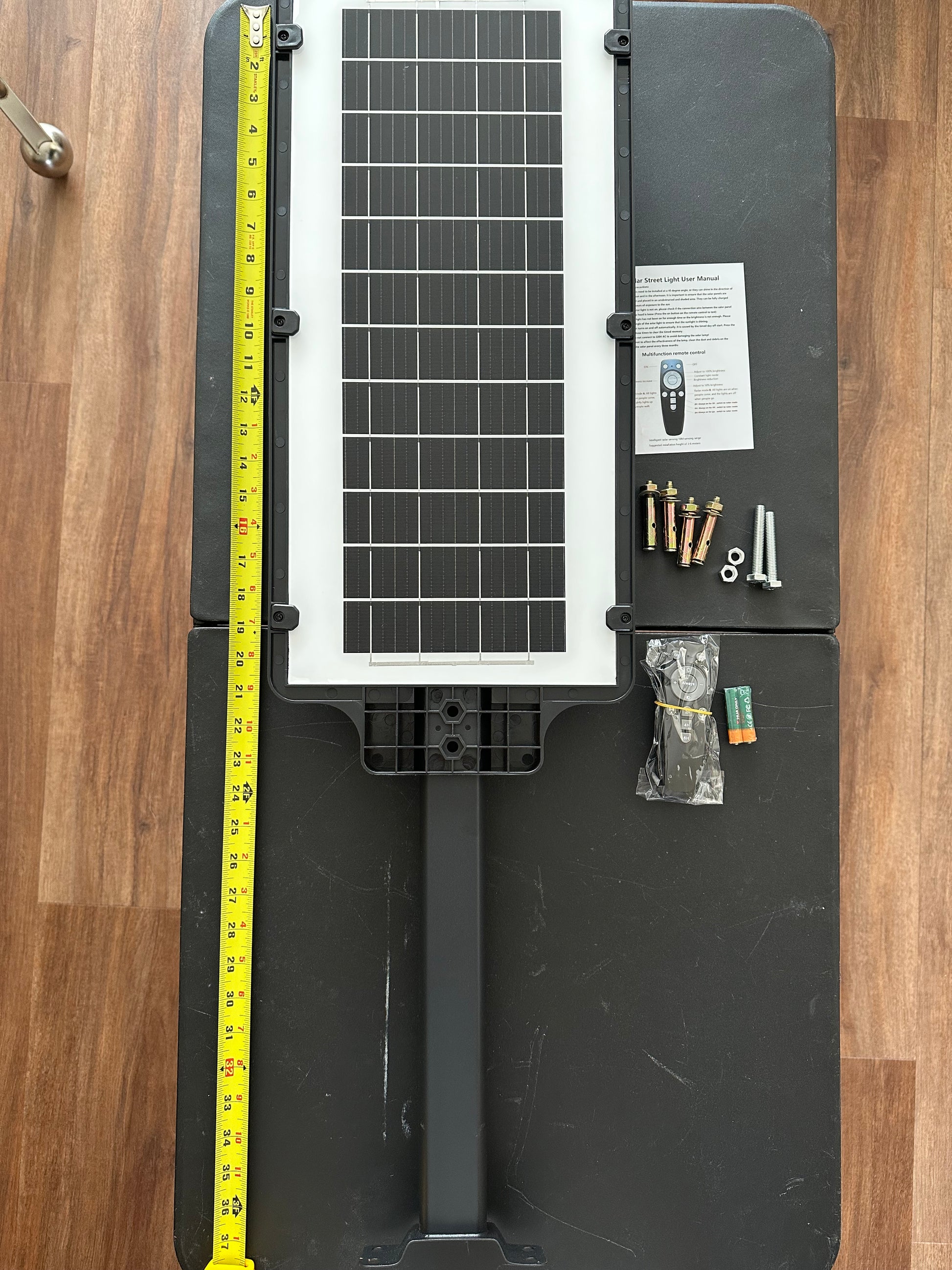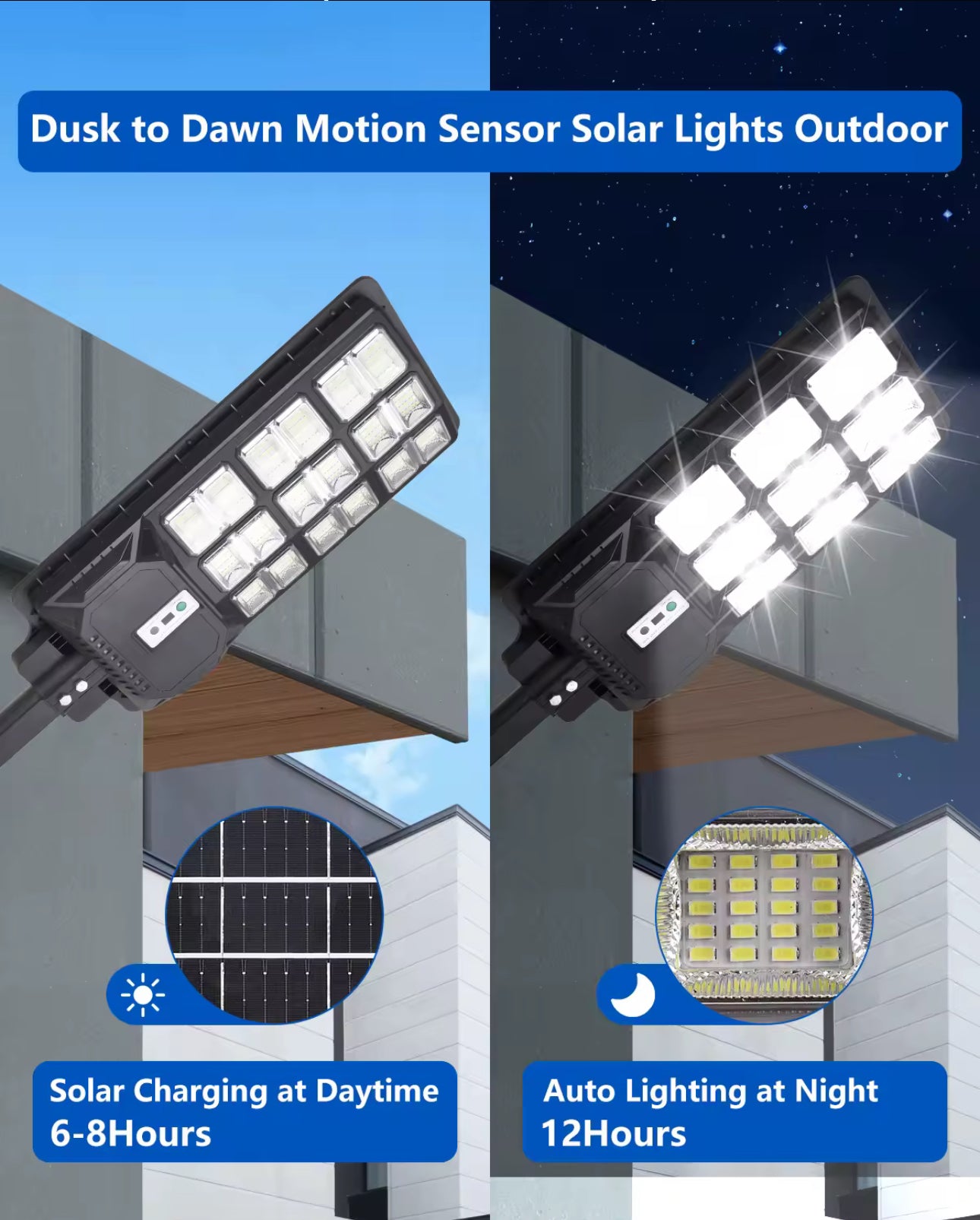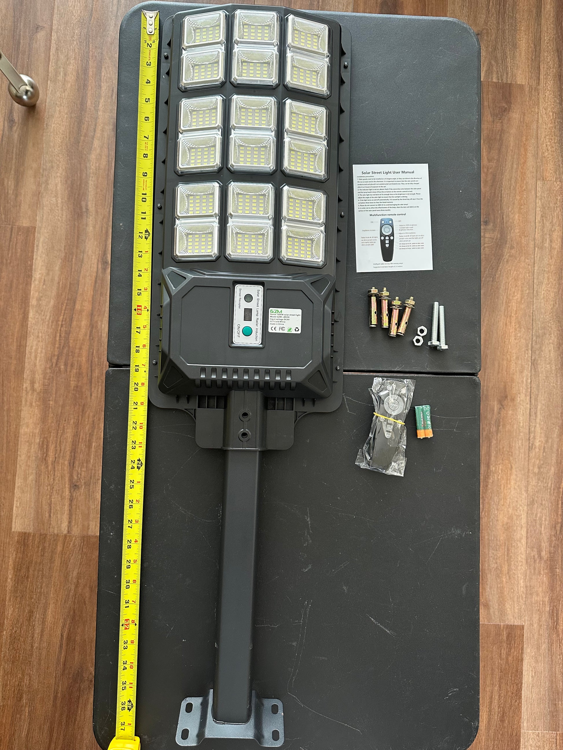 Solar Street Light with motion sensor, 1000W, LED, IP65 waterproof, weatherproof, 20,000LM, 6000K white light. For driveway, pathway, patio, deck, backyard, security lighting at the cottage.