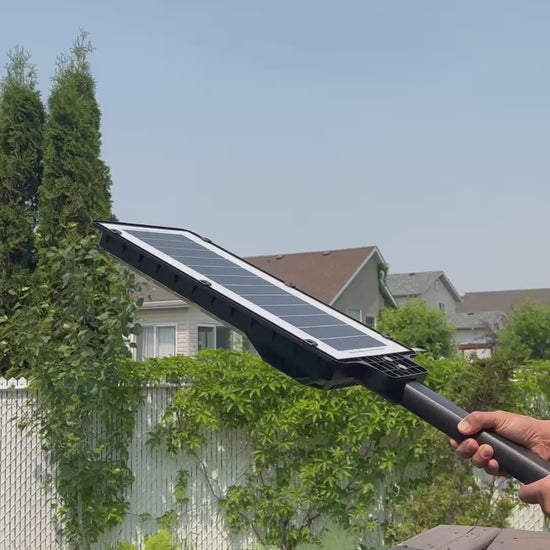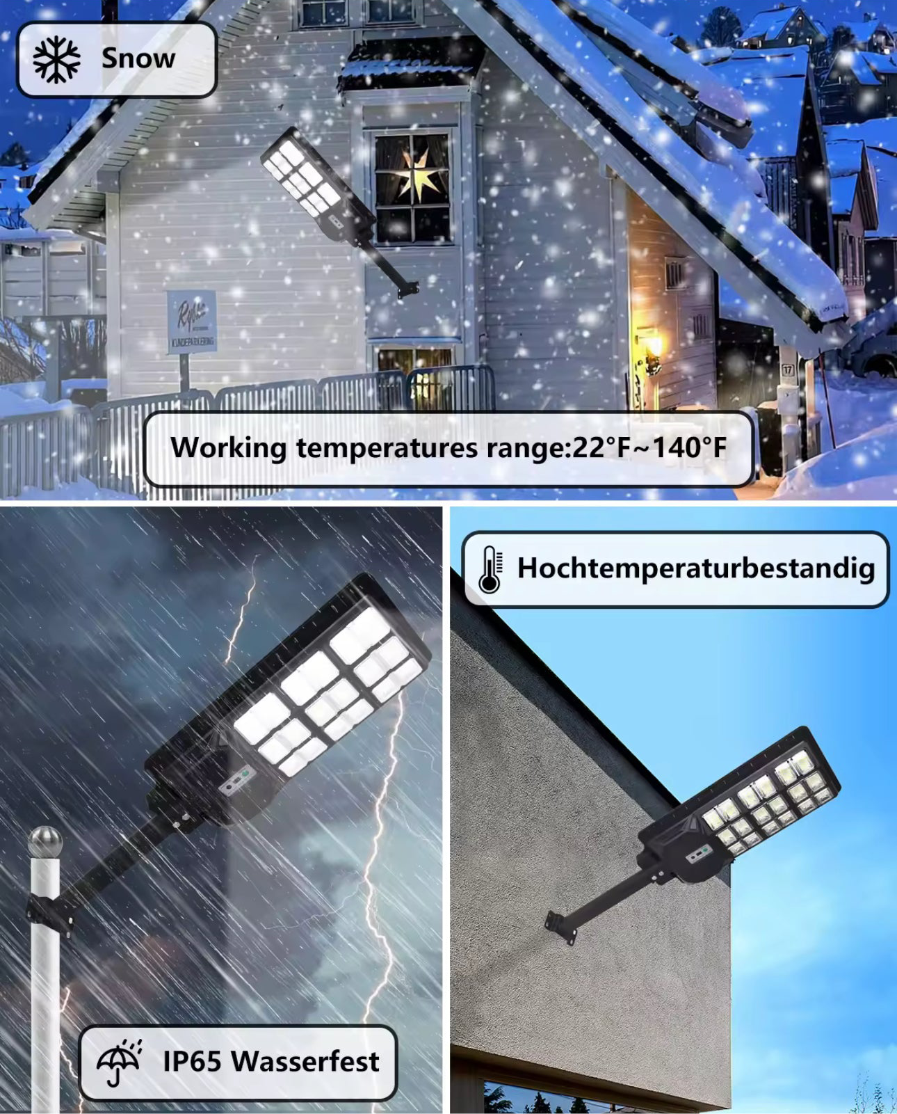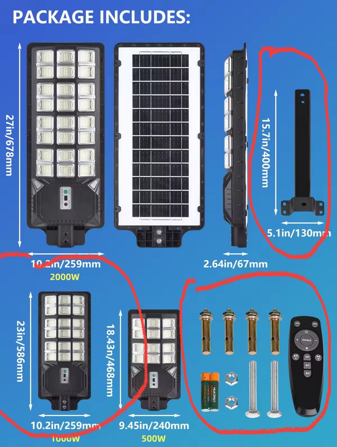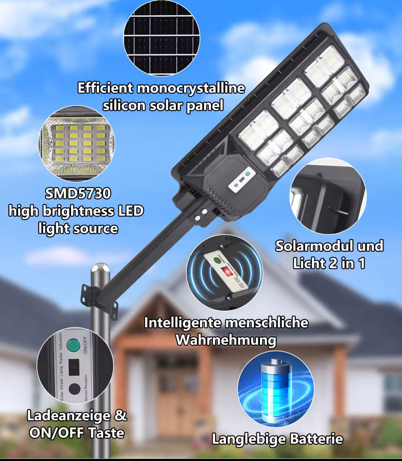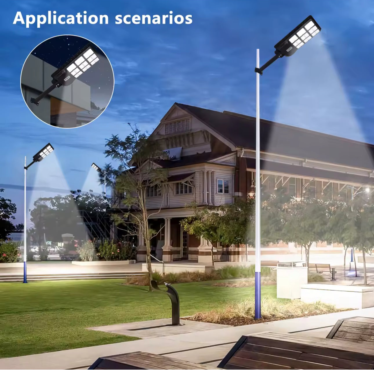 Solar Street Light with motion sensor, 1000W, LED, IP65 waterproof, weatherproof, 20,000LM, 6000K white light. For driveway, pathway, patio, deck, backyard, security lighting at the cottage.