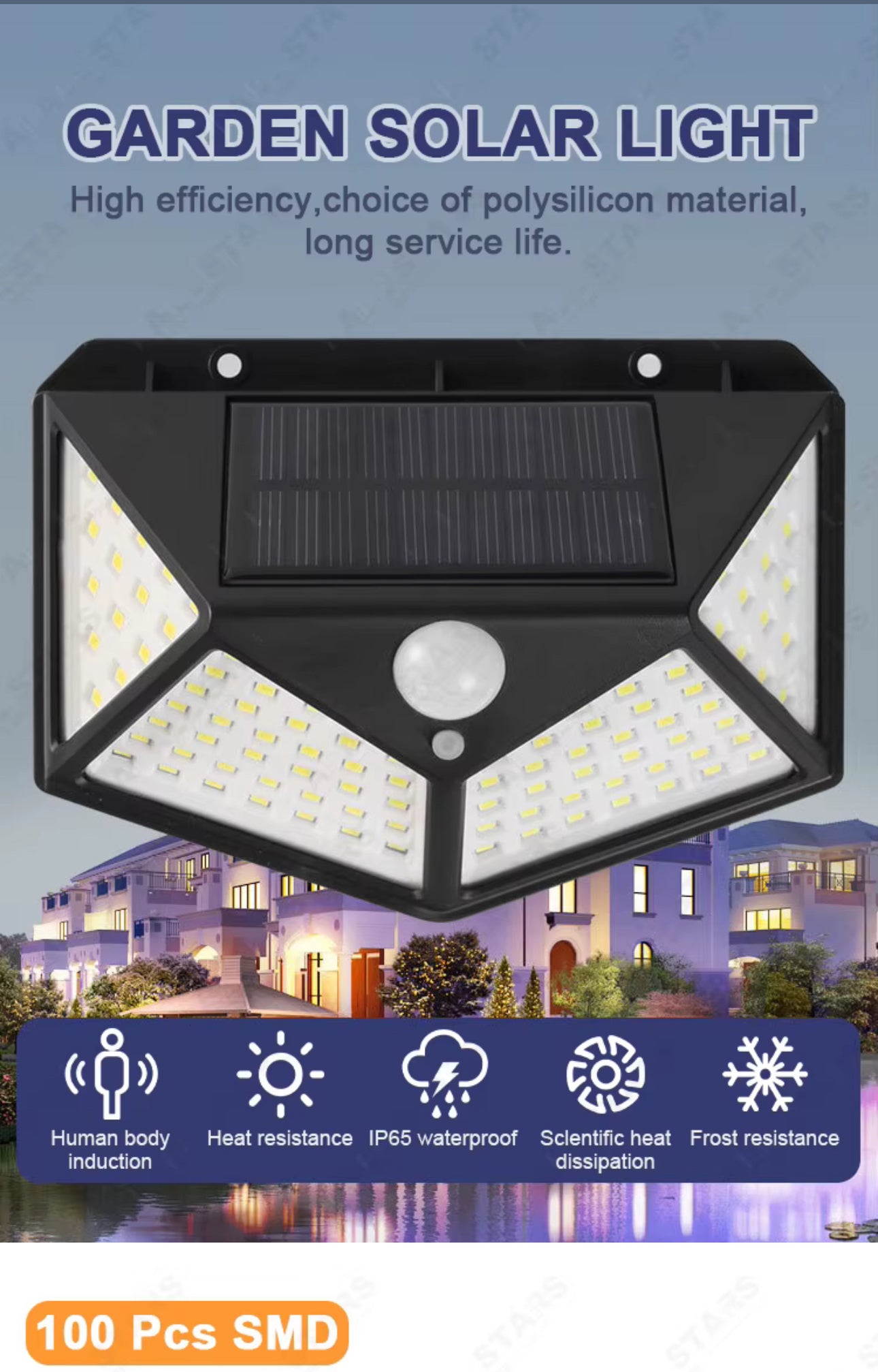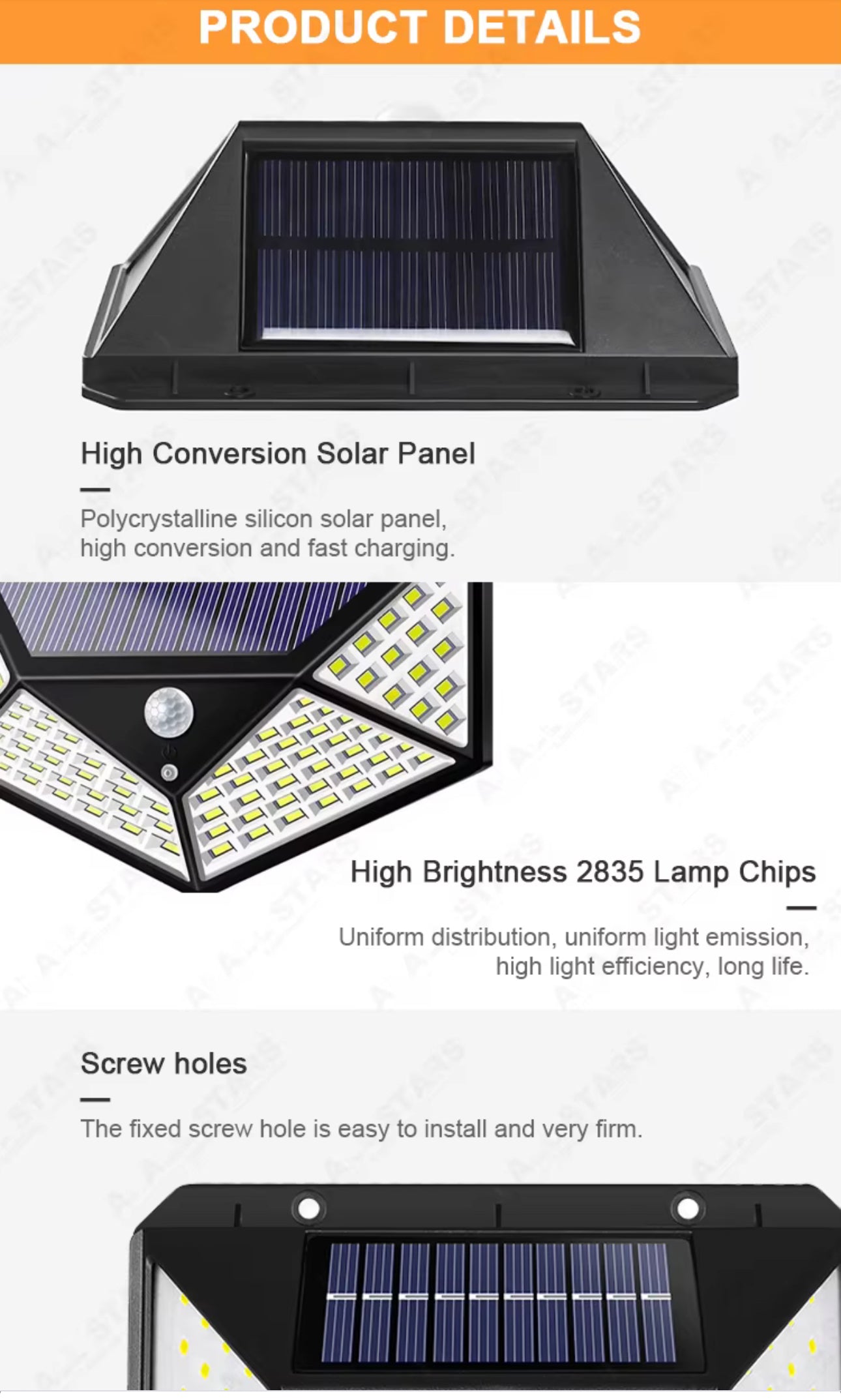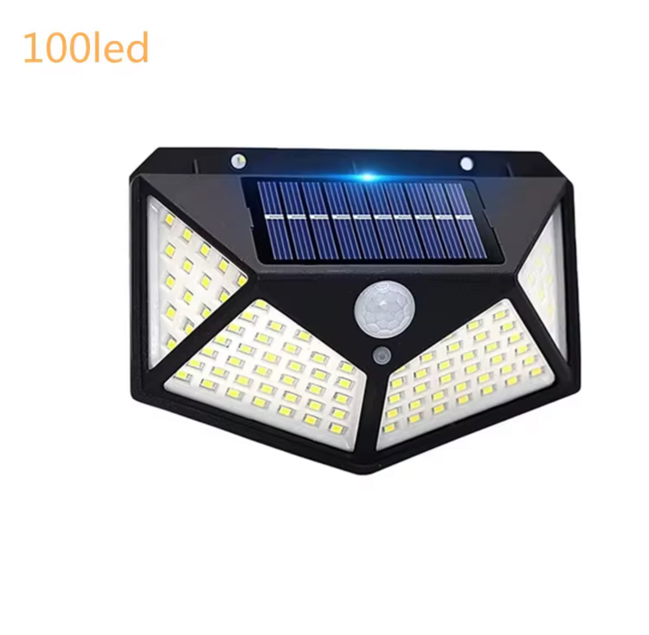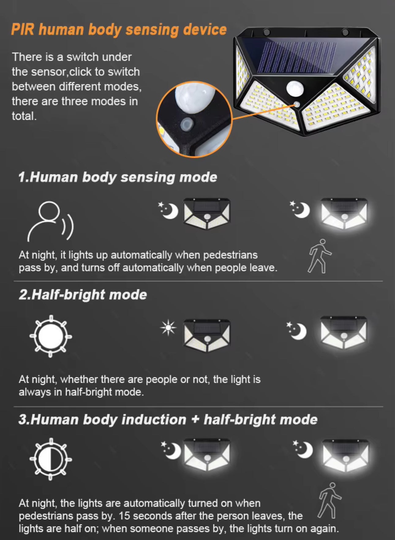 100LED solar waterproof four-sided human body induction wall light switch front setting is easier to operate, and added indicator light display, energy saving and environmental protection, green lighting, long life, durability, low fault repair rate, high radiation stability, simple installation (only need 2 Screws can be fixed on the outdoor wall that can be sun-lit. It is easy to use, intelligent light-sensing control, no adjustment, energy-saving and convenient, making your home more beautiful and intelligent.