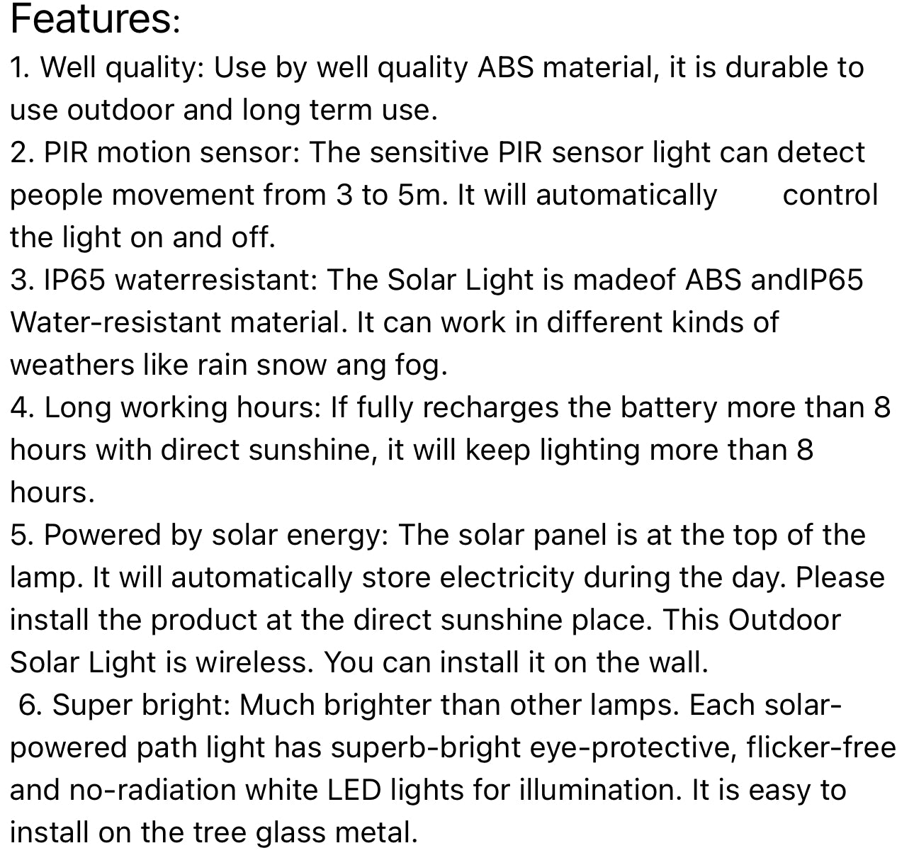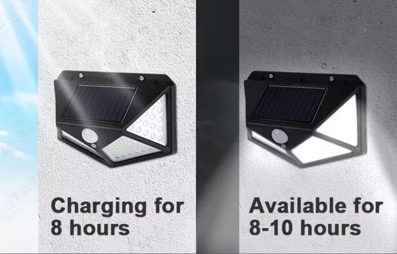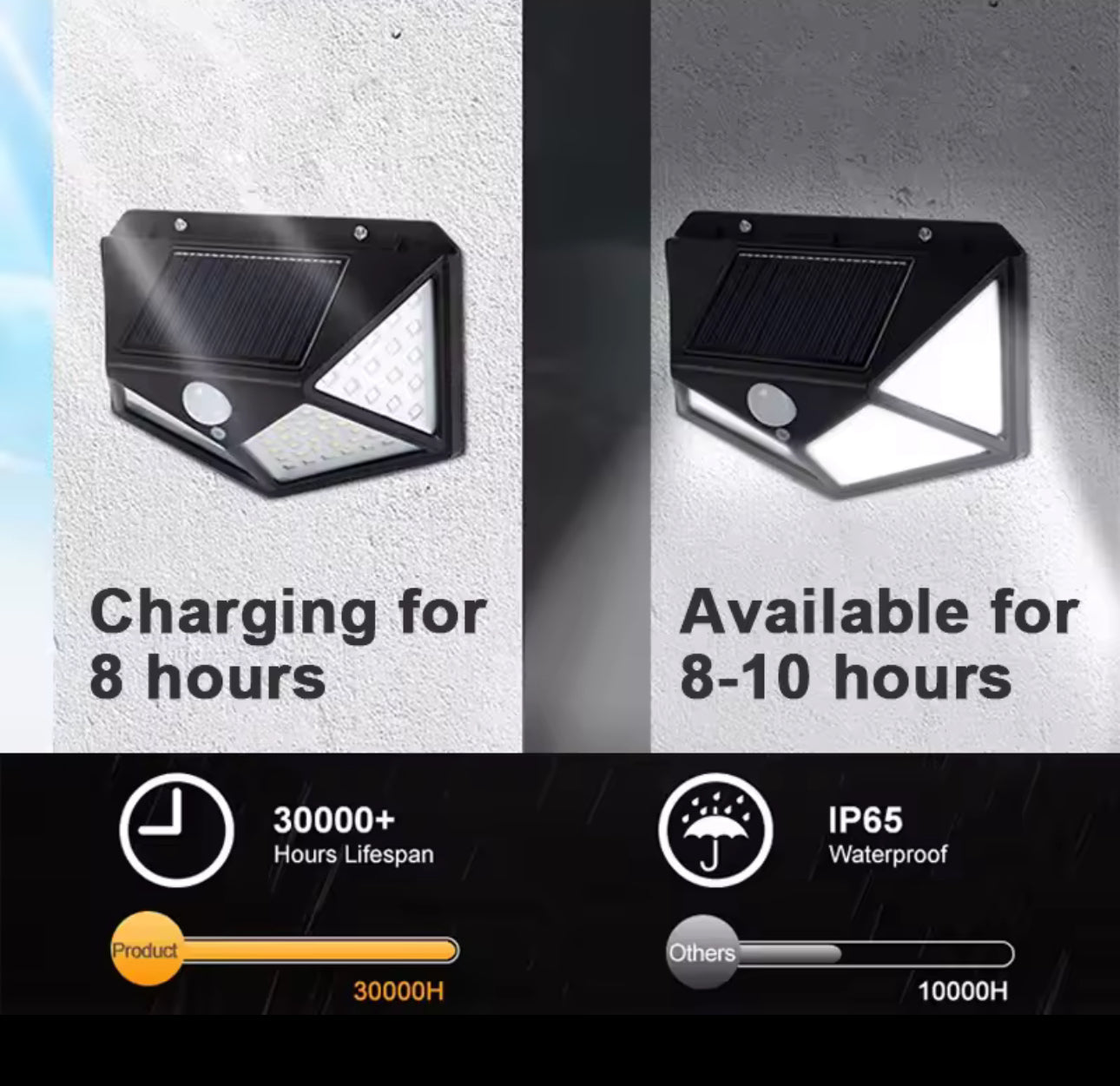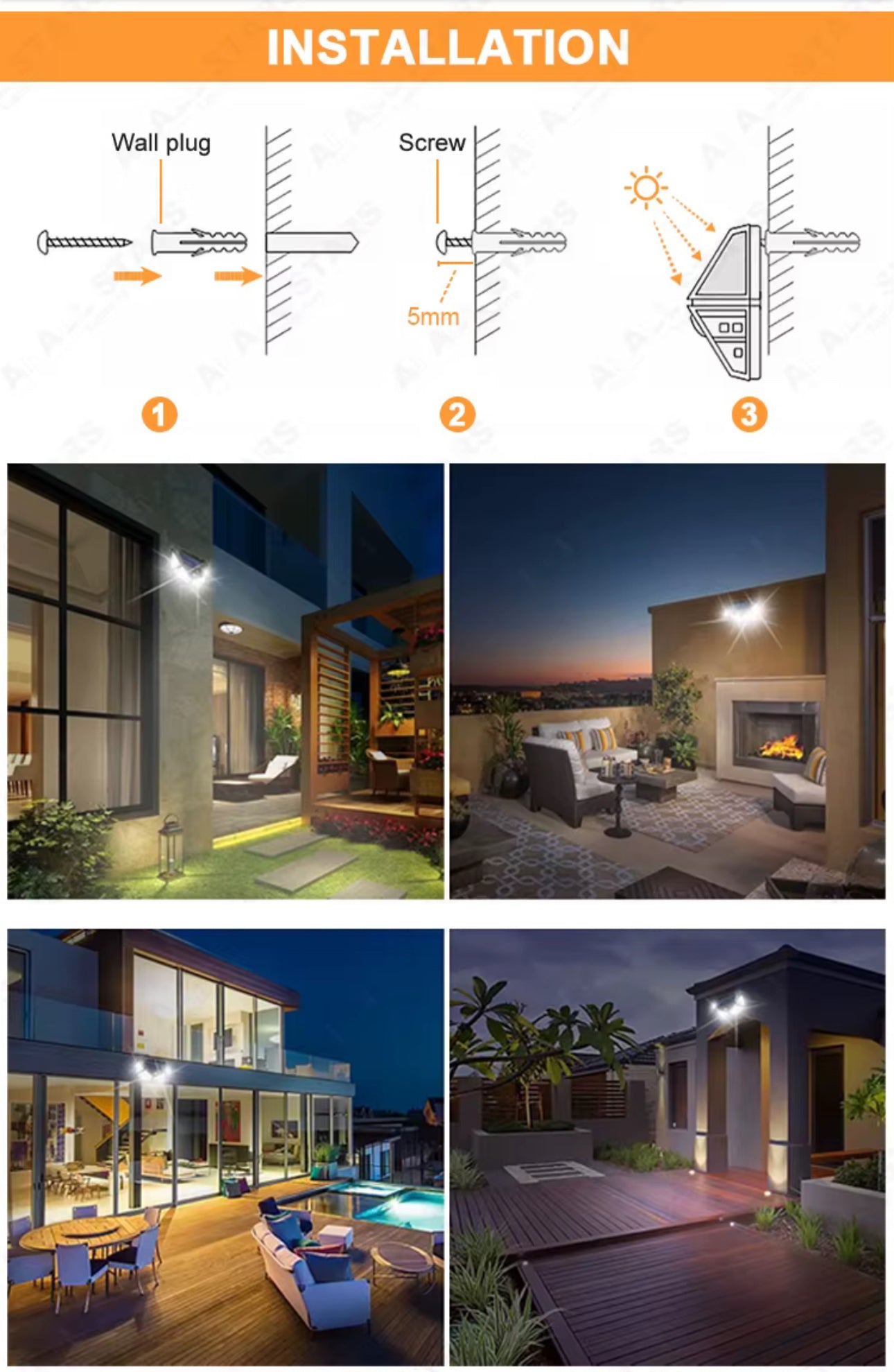 100LED solar waterproof four-sided human body induction wall light switch front setting is easier to operate, and added indicator light display, energy saving and environmental protection, green lighting, long life, durability, low fault repair rate, high radiation stability, simple installation (only need 2 Screws can be fixed on the outdoor wall that can be sun-lit. It is easy to use, intelligent light-sensing control, no adjustment, energy-saving and convenient, making your home more beautiful and intelligent.