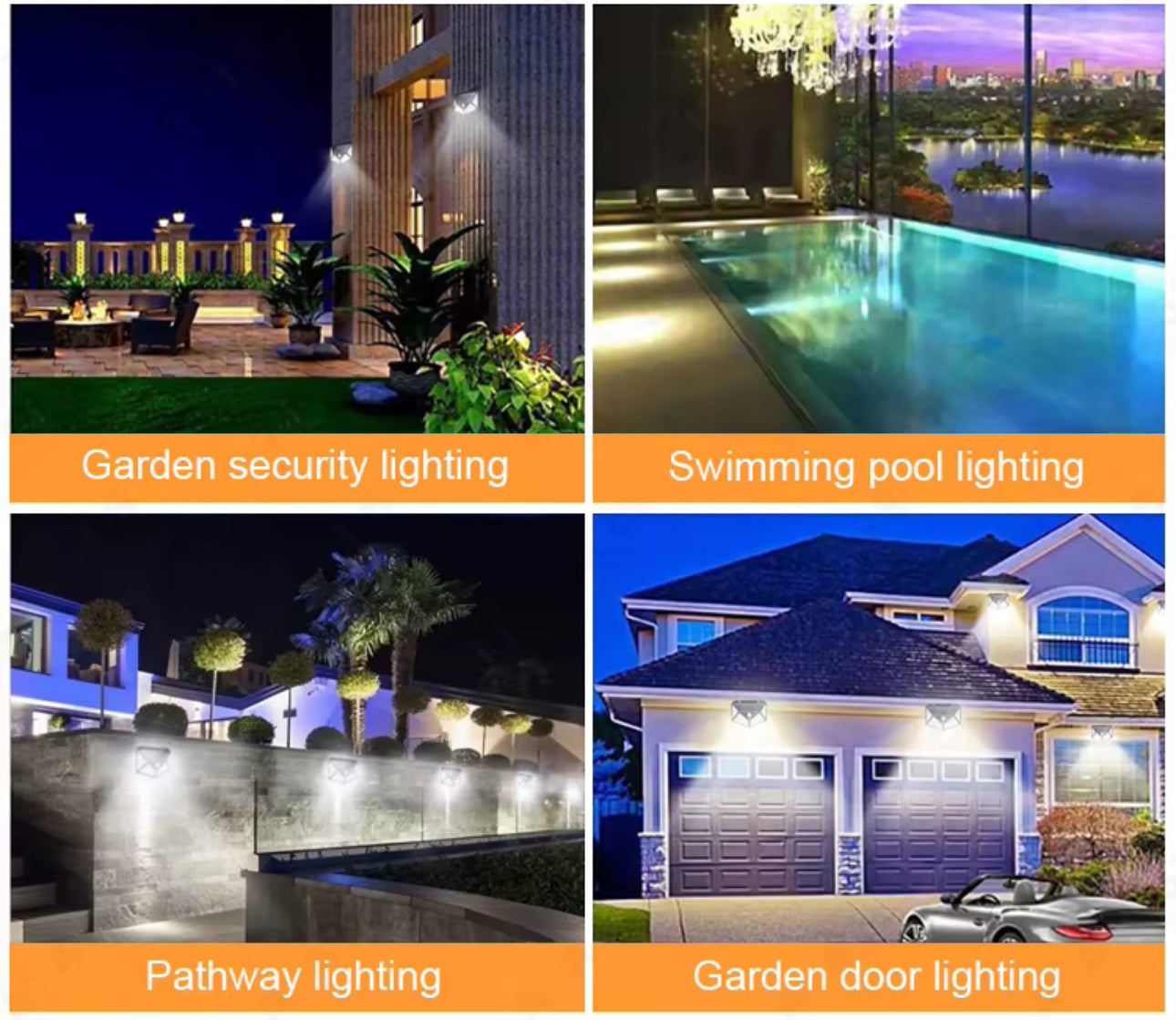 100LED solar waterproof four-sided human body induction wall lamp is suitable for outdoor corridors, garden gates, roof terraces, courtyard wall, villas, shop windows, shops, homes and other outdoor environments, no wiring, no electricity, exquisite craftsmanship and unique design.